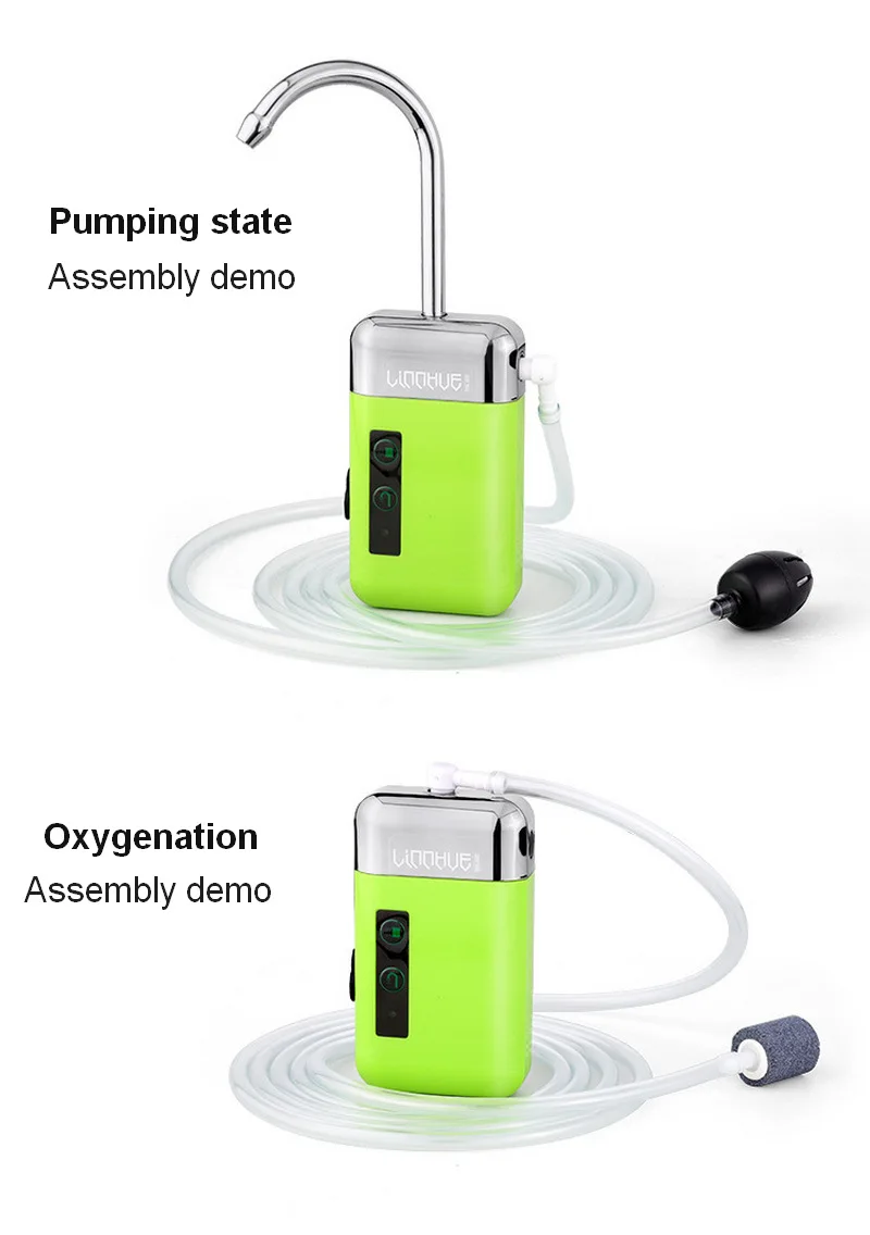 1 X Fishing Oxygen Pump 1 outlet pipe 1 X USB charging cable 1 X Oxygenated transfer joint 1 X Water intake filter 1 X Air Pump Stone 1 X Air pipe