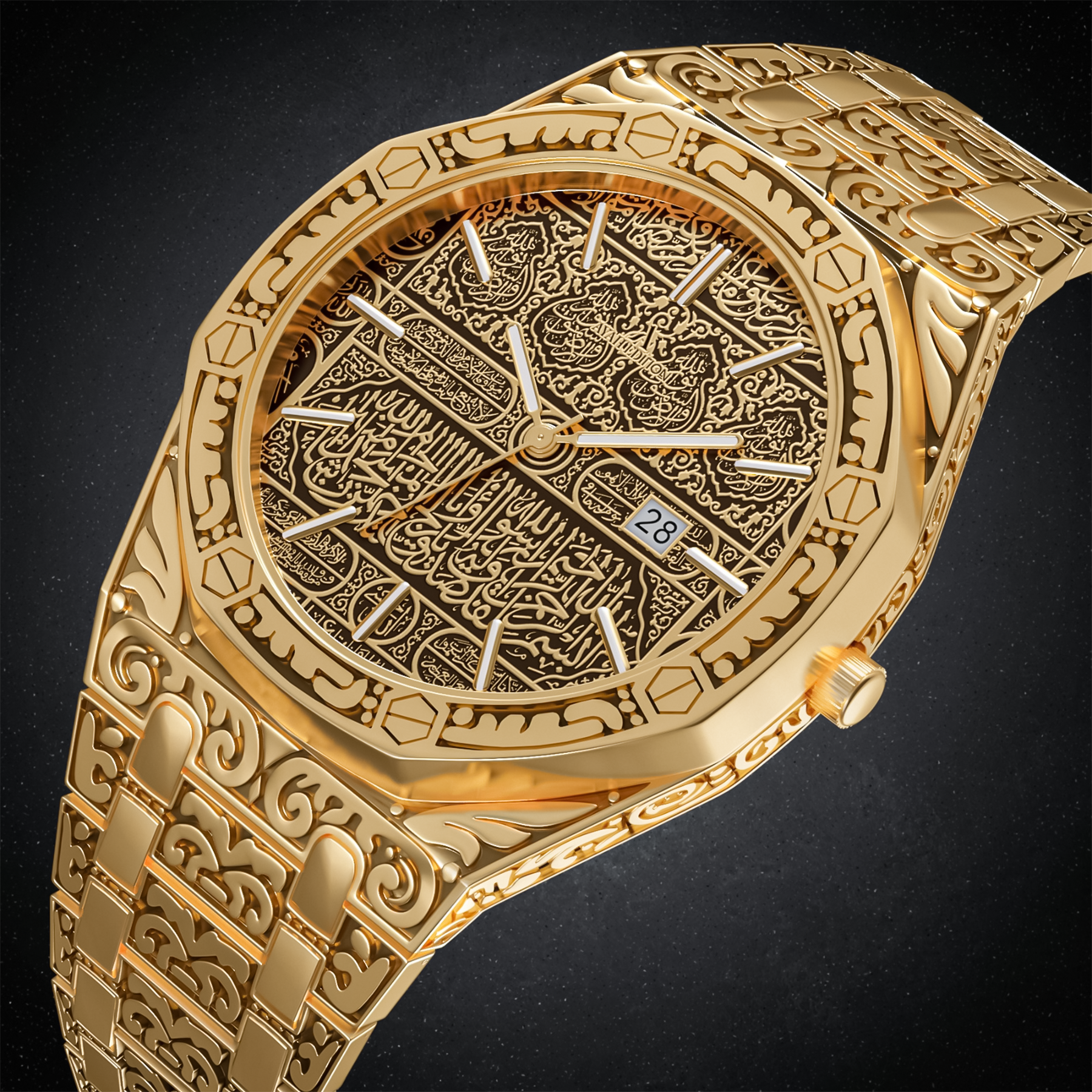 One of our most iconic and successful Limited Edition timepiece is back, this time with an inscription from the most holy place in Islam, Mecca. True traditional timepiece, showcasing a pattern taken from the gold-laced detailing of the Kaaba. A unique piece that demands attention and lifts your outfit to a new class.Â