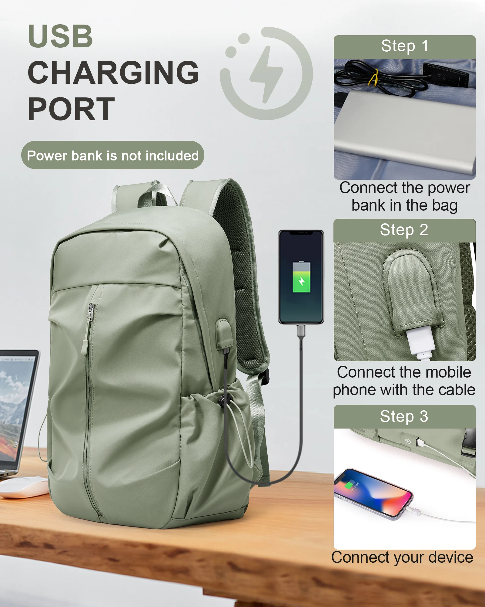 Stay connected on the go with our multifunctional backpack featuring a built-in USB charging port. Simply connect your power bank to keep your devices charged while you're on the move, ensuring you never run out of battery when you need it most.